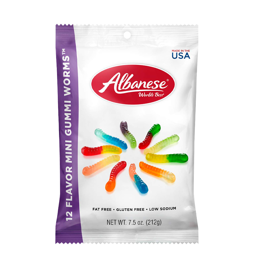 Deliciosas gomitas en forma de gusano. Después de un bocado saborearás la diferencia 12 sabores de fruta distintos y suave al masticar, diferente a las otras gomitas Sabemos que una vez que pruebes Albanese no querrás otras gomitas