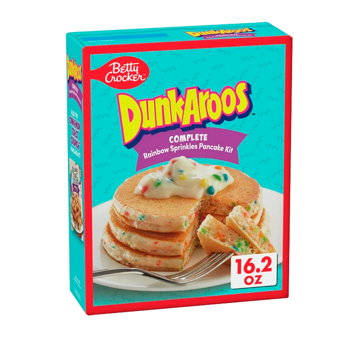 MEZCLA PARA PANCAKES: ¡Tu refrigerio favorito de los 90 está de vuelta con un nuevo giro! El kit de panqueques Dunkaroos Rainbow Sprinkles ofrece el sabor clásico de Dunakroos como panqueques cálidos y esponjosos completos con glaseado de arcoíris. Un desayuno dulce y cálido lleno de sabor que encantará a toda la familia.